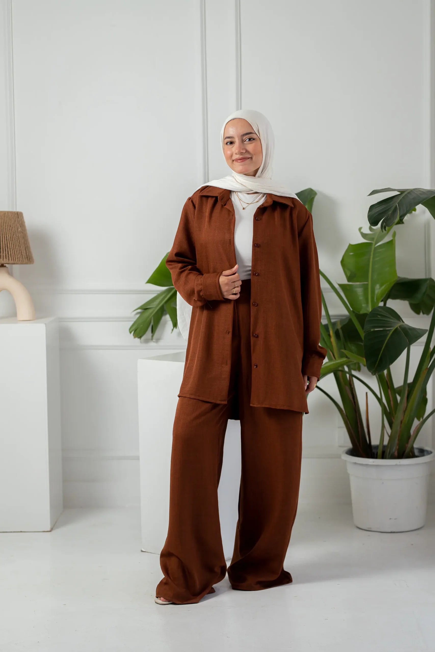 Step into confidence with our Rust Oversized Two-Piece Set, designed for the modern woman who values both style and ease. This set features a relaxed-fit shirt with button-down detailing and wide-leg pants, offering ultimate comfort without compromising elegance.